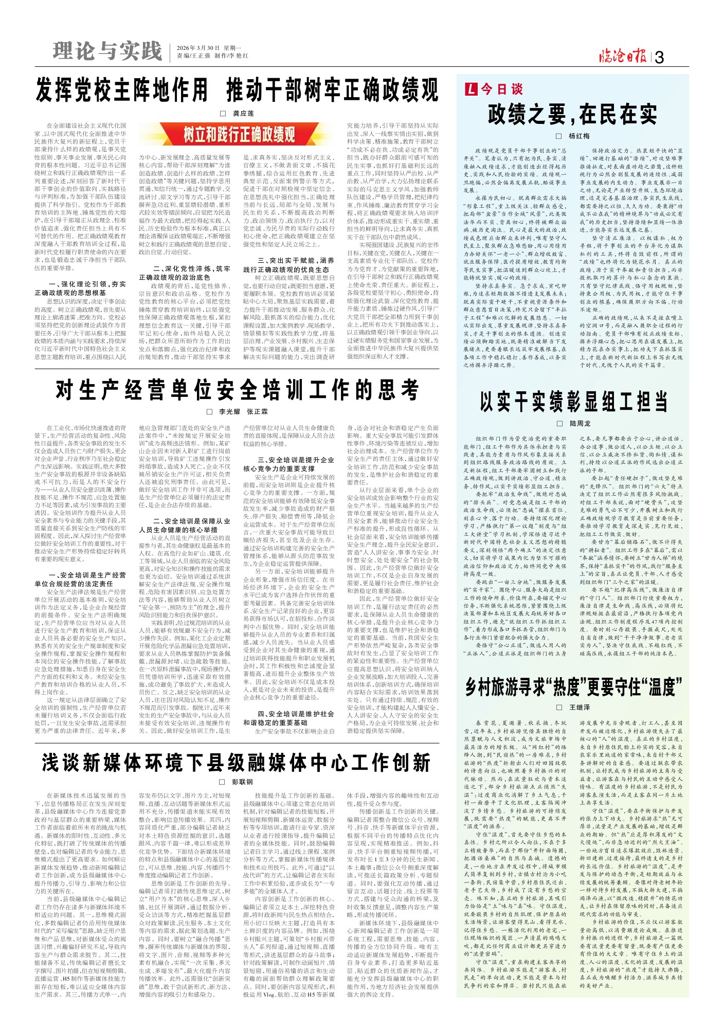 组织部门作为管党治党的重要职能部门,组工干部作为具体承担者与实践者,其能力素质与作风形象直接关系到组织路线服务政治路线的质效。立足新征程,组工干部要牢固树立和践行正确政绩观,做到讲政治、守公道、精业务、转作风,以实干实绩彰显组工担当。