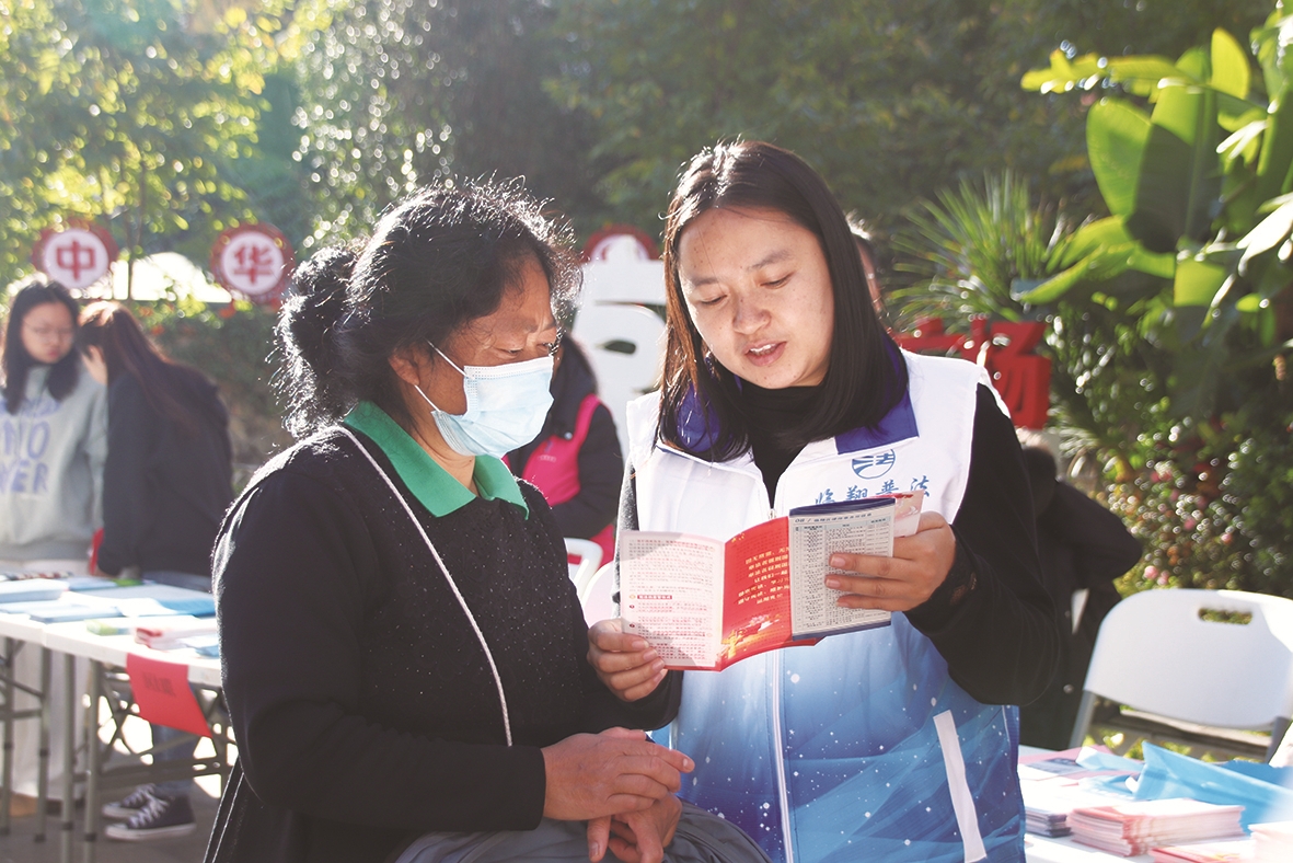 图为工作人员向群众普及法律知识。