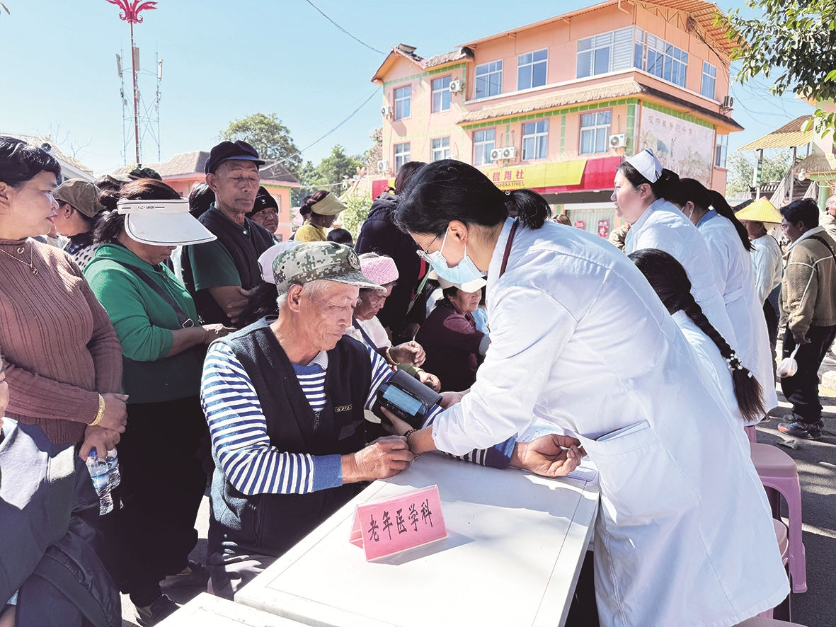 近日,我市首场“情暖边疆送健康”线下活动在沧源佤族自治县班洪乡班洪村展开,活动邀请市医院专家开展急救健康知识培训和义诊。同时,活动还开展了普法宣传,通过发放宣传资料、现场讲解等方式,向村民普及法律知识。图为义诊现场。