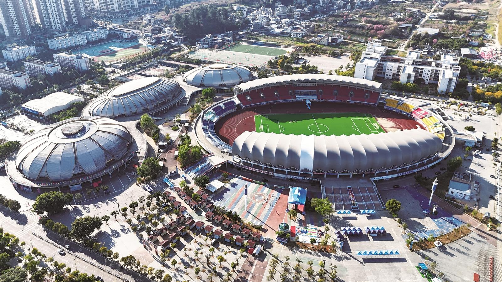 近年来,临沧不断推动公共体育场馆向社会免费或低收费开放,为群众就近参与体育锻炼提供便利,全民健身的基础设施建设、公共服务供给等得到极大提升。图为临沧市体育运动中心俯瞰。